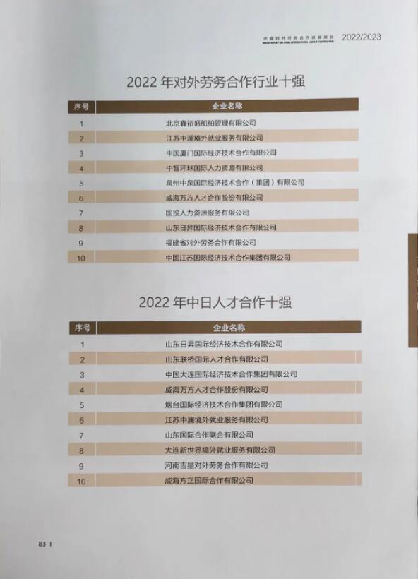 萬方人才公司再次榮登“對外勞務(wù)合作行業(yè)十強(qiáng)企業(yè)”、“中日人才合作十強(qiáng)企業(yè)”榜單